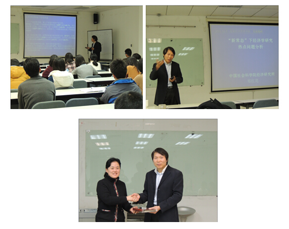 2014年12月8日下午16:00在新主楼A928教室,由院科研办和金融系联合主办了学术高端论坛——“新常态经济学热点问题”。邀请中国社会科学院经济研究所研究员、《经济研究》常务副主编郑红亮教授做学术讲座。