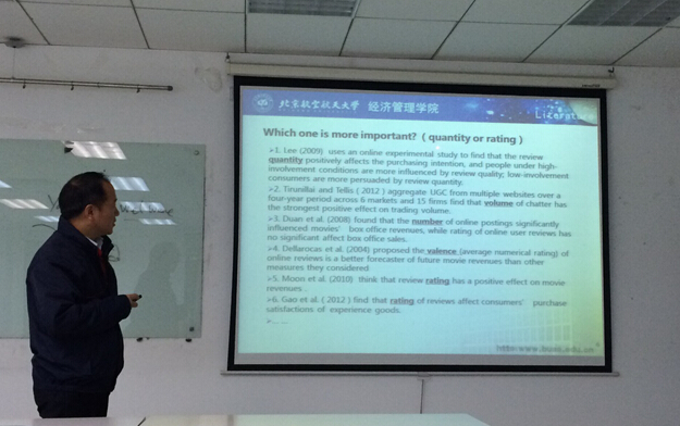 11月21日晚,bat365官网信息系统系教授姚忠老师为研究生做题为《Consumer-Generated Reviews and Social Learning:Implications for Quality Perception of New Products》的讲座。出席本次讲座的有bat365官网的硕士研究生和博士研究生。讲座主要介绍了姚忠教授的最新研究成果,即消费者评论和社会学习对新产品质量感知的影响以及用户购买行为的影响。