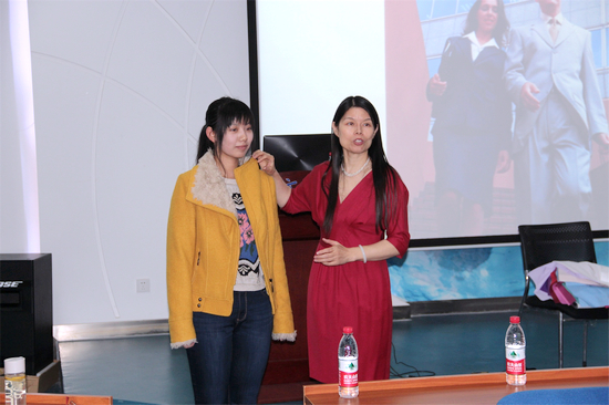 在讲座过程中,李教授更是邀请王惠文院长以及两名同学作为模特,判断她们所属颜色类型并给出着装色彩选择建议。同时还就她们的搭配做出了点评,指出优缺点,过程欢声笑语不断。在讲座的最后,王院长希望大家多学习服装色彩方面知识,提升商务形象。本次讲座在大家的热烈掌声中圆满结束。