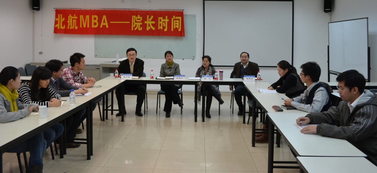 2012年12月8号17时,北航MBA教育中心在新主楼A949举办了“北航MBA—院长时间”座谈会。北航经管学院院长王惠文教授、副院长周宁教授,北航MBA教育中心主任柏满迎教授、副主任秦中峰副教授以及MBA教育中心李慧老师、张新华老师出席本次活动,与来自2011级和2012级的多名学生代表进行座谈。此次活动的主要目的是针对在读MBA学生在学习中遇到的问题和困难,以及他们对北航MBA的一些建议进行深入交流。