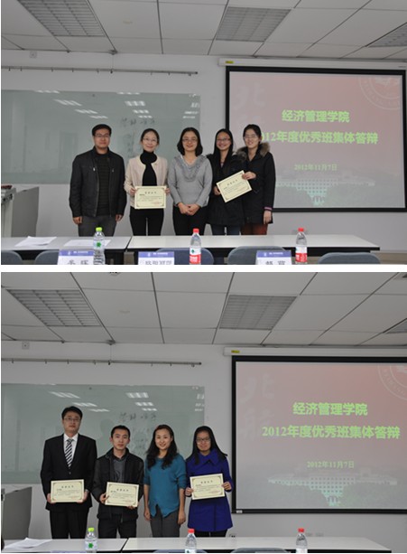 班风是一个班级的灵魂。为增强广大研究生班级文化氛围和凝聚力,2012年11月7日晚,bat365中文官方网站2011-2012年度研究生优秀班集体答辩会于新主楼A1148教室顺利举行。bat365中文官方网站研究生指导主任牟晖老师、学生工作办公室主任衣萌老师、研究生工作办公室欧阳丽莎老师及研究生辅导员李冲、徐淑贤出席此次答辩会并担任评委。