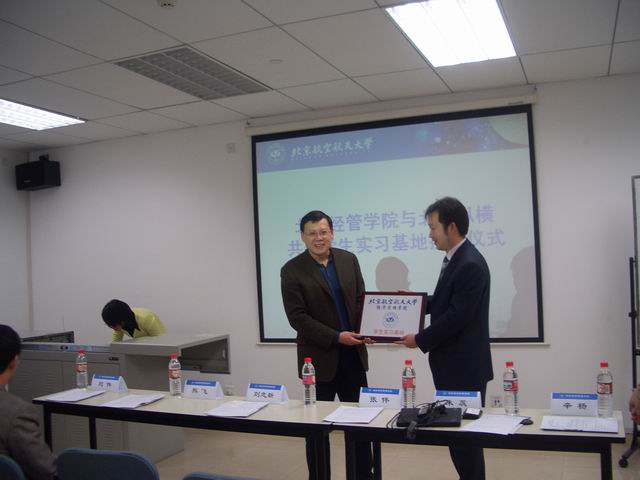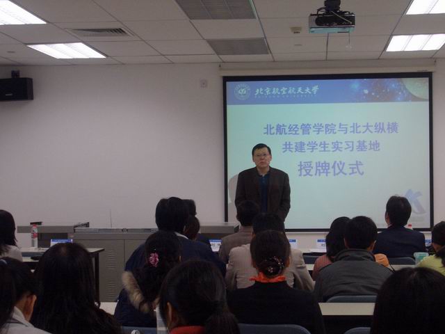 2008年11月21日16:00,北航经管学院——北大纵横共建学生实习基地授牌仪式暨北大纵横高校行专题讲座在新主楼A949隆重举行,经管学院党委书记刘志新教授、职业发展中心主任牟晖博士、MBA教育中心熊飞博士、分团委书记刘件老师;北大纵横管理咨询公司副总经理、营销中心总经理张伟先生、市场总监朱蕊女士、市场经理辛杨女士出席了授牌仪式。