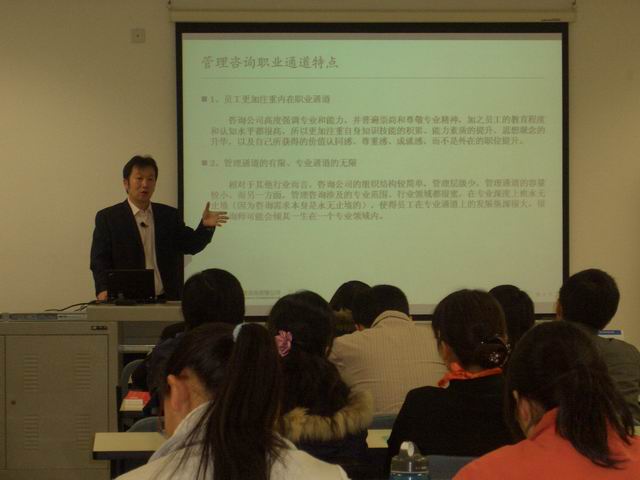 授牌仪式结束后,张总经理为同学们做“如何在管理咨询行业发展”的专题讲座,详细介绍了中国管理咨询行业的现状与发展前景以及北大纵横对人才的需求模式,并接受同学们的提问。至此,授牌仪式暨高校行专题讲座圆满结束。