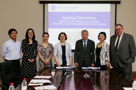 2018年5月29日上午,约克大学舒力克商学院院长DezsöJ. Horváth教授、高管教育中心执行主任Alan Middleton教授、高管教育中心中国事业部总经理DollyShao女士访问bat365官网。经管学院院长范英教授、北航国际交流合作处吕莹副处长、经管学院副院长牟晖副教授、院长助理郝金星副教授出席会谈。双方商谈了包括学生交换、一年期硕士项目、高管培训项目等具体细节,并举行了框架合作协议续签仪式。
