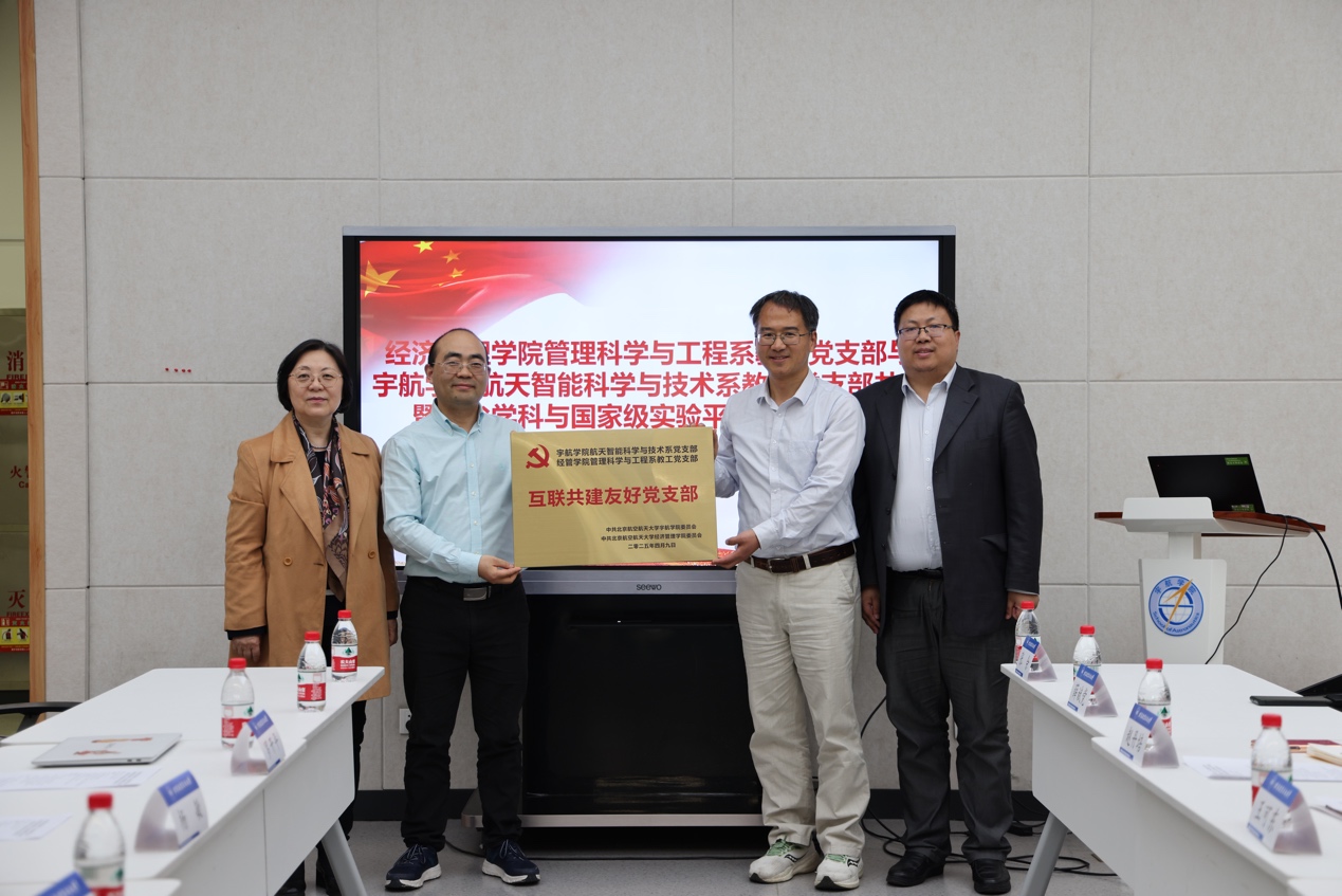 首先,两个支部举行了”互联共建友好党支部”授牌仪式,标志着跨学科党建协同创新机制的正式落地。然后,宇航学院王伟宗院长从学院历史发展出发,回顾了学院在专业发展、学科建设和国家重点实验室建设中的攻坚历程与创新实践;经管学院范英院长描绘了近期拟联合共建的太空经济与资源管理实验平台的战略定位,强调依托两院在轨道动力学与经济建模领域的学科优势,共同构建空间资源开发的跨学科决策支持体系。随后,航天智能科学与技术系教师党支部书记王可东和管理科学与工程系教师党支部书记罗开平分别介绍了各系的师资构成、科研主攻方向及近期取得的突破性成果,充分展现了党支部在学科建设中的引领作用。