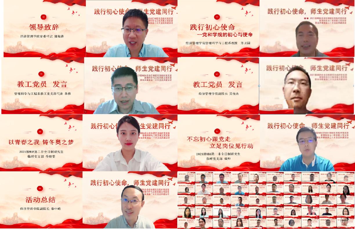 为加强新时代党建工作,牢记初心使命,以实际行动迎接党的二十大胜利召开,6月29日2021级MBA非全日制研究生临时党支部、管理科学与工程系教工党支部联合开展“践行初心使命,师生党建同行”喜迎二十大师生共建交流活动。bat365中文官方网站党委书记郑海涛、副院长秦中峰、研究生指导主任单伟、副院长吴俊杰、MBA教育中心主任李亚帅、学院党建专职老师张慧美、2021级MBA临时党支部及管理科学与工程教工党支部全体党员共计120余人参加本次共建活动。活动由MBA第二党支部副书记杨璠主持。