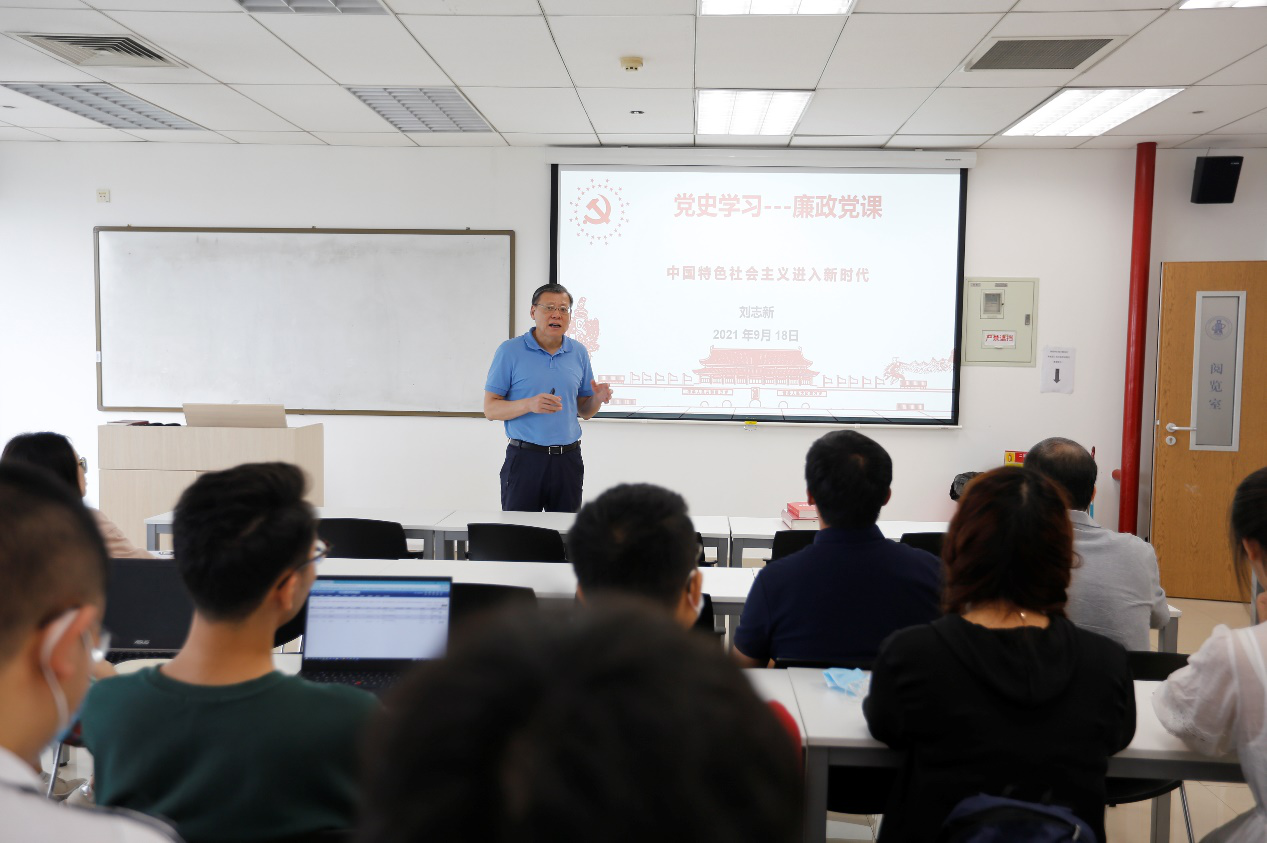 2021年9月18日上午,bat365中文官方网站党委书记刘志新在新主楼A706教室讲授题为“中国特色社会主义进入新时代”的廉政党课。师生支部书记、半脱产辅导员、学生工作负责人和专职组织员40人参加学习。