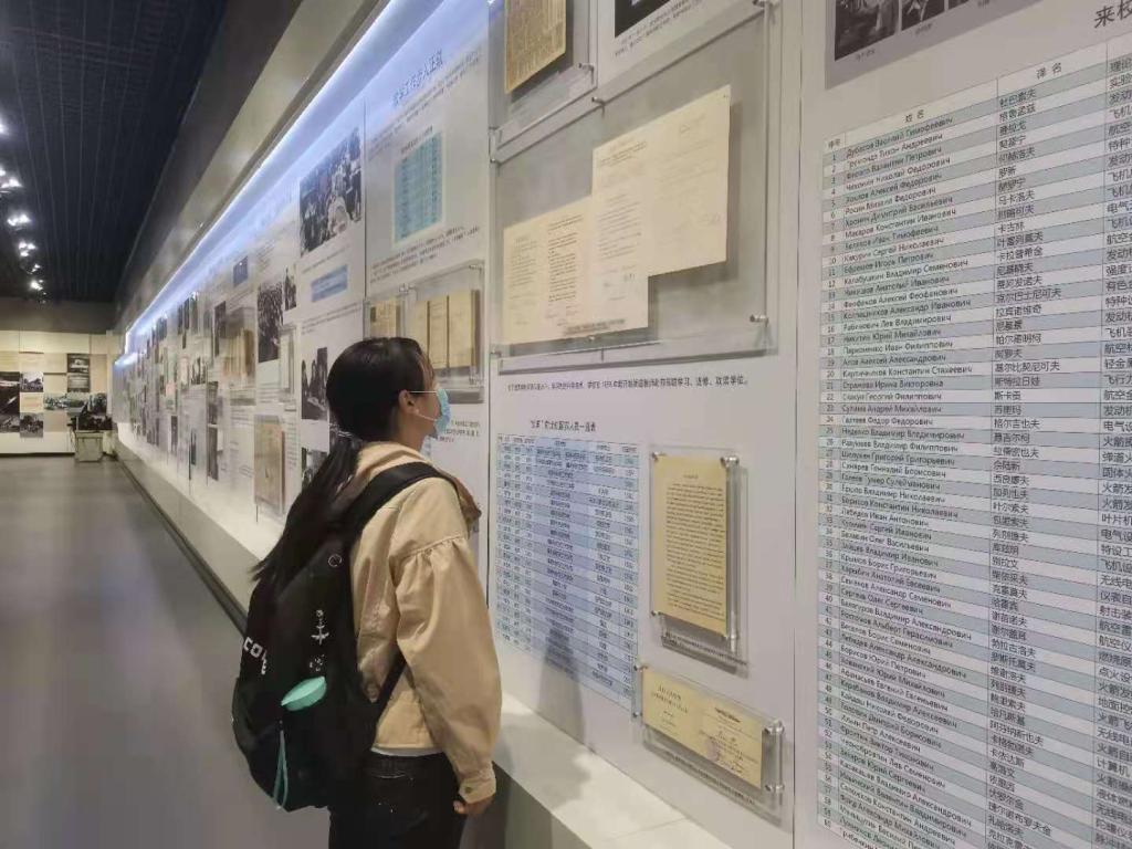 “初见校史”部分,学生们自行参观航空馆和校史馆,从长空筑梦、银鹰巡空、神州问天、空天走廊4个展区一次走过,了解了机械工程师的智慧和心血,以及探索空天的梦想和历程。