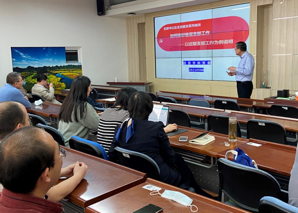 2021年5月6日中午,bat365中文官方网站在A622教室开展教工党支部书记培训,学院分党委书记刘志新主持会议,全体教工支部委员、学生工作负责人和专职组织员近40人参加会议。