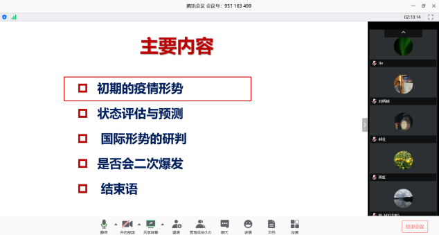 接着围绕如何在抗疫中发挥统计人的力量,潜心科研和教学,在座老师进行了热烈的交流与讨论。对于王惠文教授的报告,所有老师听得都很感动,纷纷表示王老师的工作太有意义,很受启发。其中,崔志伟书记表示对于全国工薪阶层复工复产很重要,而从王老师做的这么多工作中,可以为复工复产提供很多决策参与意义,从这大量的工作中我看到了我们做为教师,尤其是做数据分析的统计人的使命和初心,王老师的工作和精神值得我们学习;正像王老师说到的一样,从中国的抗疫经验看出我们党的领导太强大了;而国际一些国际的做法对自己的不负责,对全球的也是不负责,其实我们是命运共同体,只有当全球抗疫都取得成效,我们才可以走出国门正常工作生活。马杰老师指出疫情当前,我们作为教师,教书育人、将论文写在祖国的大地上,顶天立地,需要像王老师一样做些有意义的科研工作,这也是我们做统计的初心和使命。对于线上授课,许多青年教师康雁飞、解蕴慧、刘炳越、郝壮、马莹莹等老师和资深老教师周建涛老师纷纷表示要坚守教书育人初心,潜心做好线上教学;站好自己作为教师的岗位,为抗击疫情尽全力!其中,康雁飞老师结合贝叶斯统计线上授课经历提到从录播、到直播、再到直播和录播的交叉使用,根据学生反馈需求不断更新,做好线上授课。支部书记崔志伟老师做了总结发言,老师的初心是育人,学生的初心是成才,面对疫情,我们都应在党的坚强领导下,做好教书育人的根本任务,落实“停学不停课、停课不停学”;同时潜心科研助力防控抗疫,为抗疫工作作出我们作为统计人的一份力量!