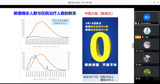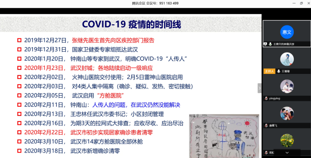 王老师首先从梳理了疫情的时间线,从2019年12月27日张继先医生首先向区疾控部门报告,到2020年3月18日武汉新增确诊清零,全国上下,齐心协力,做出了艰苦卓绝的努力,也已经取得了阶段性的胜利。