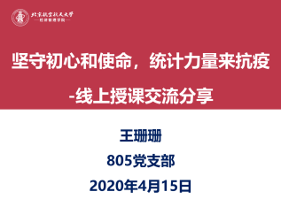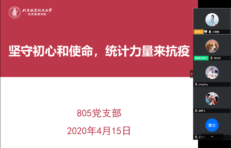 为了进一步学习贯彻习近平总书记关于科学精准防控抗疫重要指示精神,落实教育部提出的“停课不停教、停课不停学”要求,bat365中文官方网站805党支部于2020年4月15日下午15:00-17:00利用腾讯会议开展了题为“坚守初心和使命,统计力量来抗疫”主题党日“云”活动。805支部成员和805系其他非党员老师均参加了此次活动。