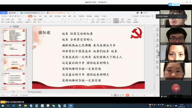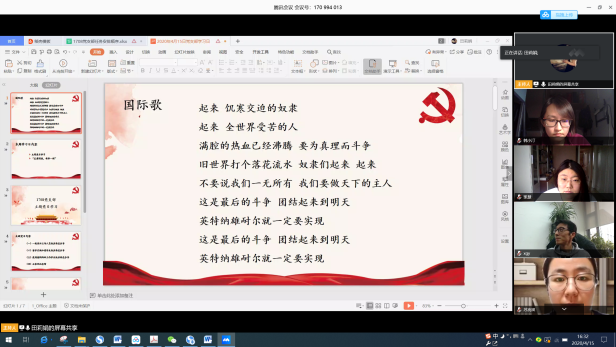 本次主题党日邀请了学院本科生廖珅的母亲分享其作为湖北医护人员在疫情期间的经历和感受。曾护士长分享了她作为眼科护士长在疫情期间所承担的主要工作,所面临的一些困难,接着讲述了党和政府对湖北地区提供的及时的支援和救助,之后生动具体地向我们描述了她在疫情期间具体的工作内容以及一些感人经历,以小见大地反映了所有的医护人员在整个疫情期间所付出的巨大努力,在抗击疫情时的万众一心。2016级本科生赵建霞和冯博佳分享作为留学交换归国学生的经历。两位本科生对自己在比利时的经历和整个回国的过程做了分享,并讲述了在整个归国的过程中,所切身体会到的国内对疫情防控相关工作的完备,以及国家所带来的安全感,表达了对祖国的热爱和自豪。学院2017级本科生吴祁颖同学分享了他参与疫情研究相关工作的经历。在疫情防控期间,吴祁颖参与王惠文教授的科研团队工作,利用数据分析监控全国地区的疫情发展情况,撰写提案,通过民建等组织提交,其中《关于考虑分期、分批恢复全国各地社会经济活动的建议》被民建中央采用,展现了当代大学生的心系祖国、心系人民的责任与担当。