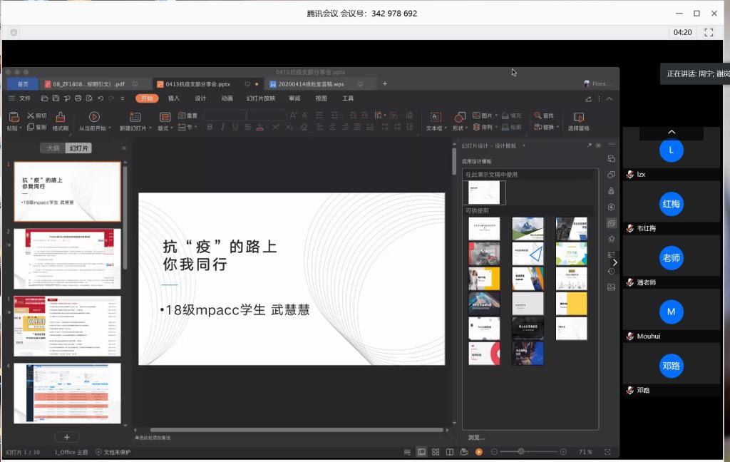 按照北航经管学院分党委基层创新活动的要求,2020年4月15日807支部联合会计系以腾讯在线会议开展组织了抗疫交流主题党日活动,组织支部全体党员以及会计系的其他非党员教师共同学习、交流身边防疫抗疫的故事和相关事迹。本次活动,支部在系主任、牟晖院长、白明老师和周宁老师的大力支持下,邀请了五位MBA,MPACC的在读学生,通过汇报和交流他们在抗疫工作中的故事、心得和体会,与本支部、本系全体教师共同学习。参会人员为:9名全体支部党员和6名会计系非党员教师、5名交流嘉宾。