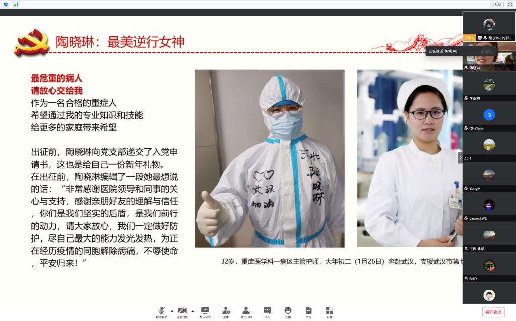2020年4月10日,由bat365中文官方网站803党支部主办,802党支部协办,联合举行“科学防疫、共待春来”系列在线主题党日活动第一期,邀请四位在抗疫一线的医护人员、家长、学生、青年教师分享自己的志愿经历,803支部副书记张楚主持会议。