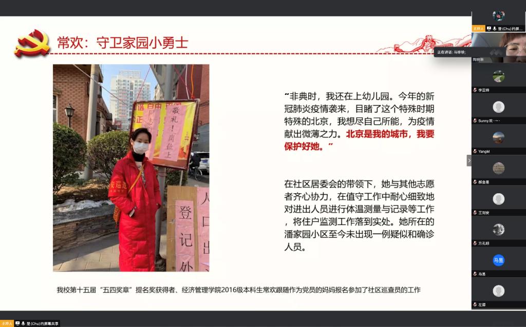 在疫情暴发初期,常欢便跟随作为党员的妈妈报名参加了社区巡查员的工作。在社区居委会的带领下,她与其他志愿者齐心协力,在值守工作中耐心细致地对进出人员进行体温测量与记录等工作,将住户监测工作落到实处。充分发挥模范先锋引领作用,以丰富的现场处置能力为居民的生命和财产安全保驾护航,用实际行动展现了一名当代青年的使命与担当。她所在的潘家园小区至今未出现一例疑似和确诊人员,社区安全地渡过疫情高峰期。会上,常欢与各位党员同志介绍了自己加入社区志愿活动的初心,分享了自己在社区居委会工作的点滴,及对社区防疫工作的思考。她谈到,“今年的新冠肺炎疫情袭来,目睹了这个特殊时期特殊的北京,我想尽自己所能,为疫情献出微薄之力”。