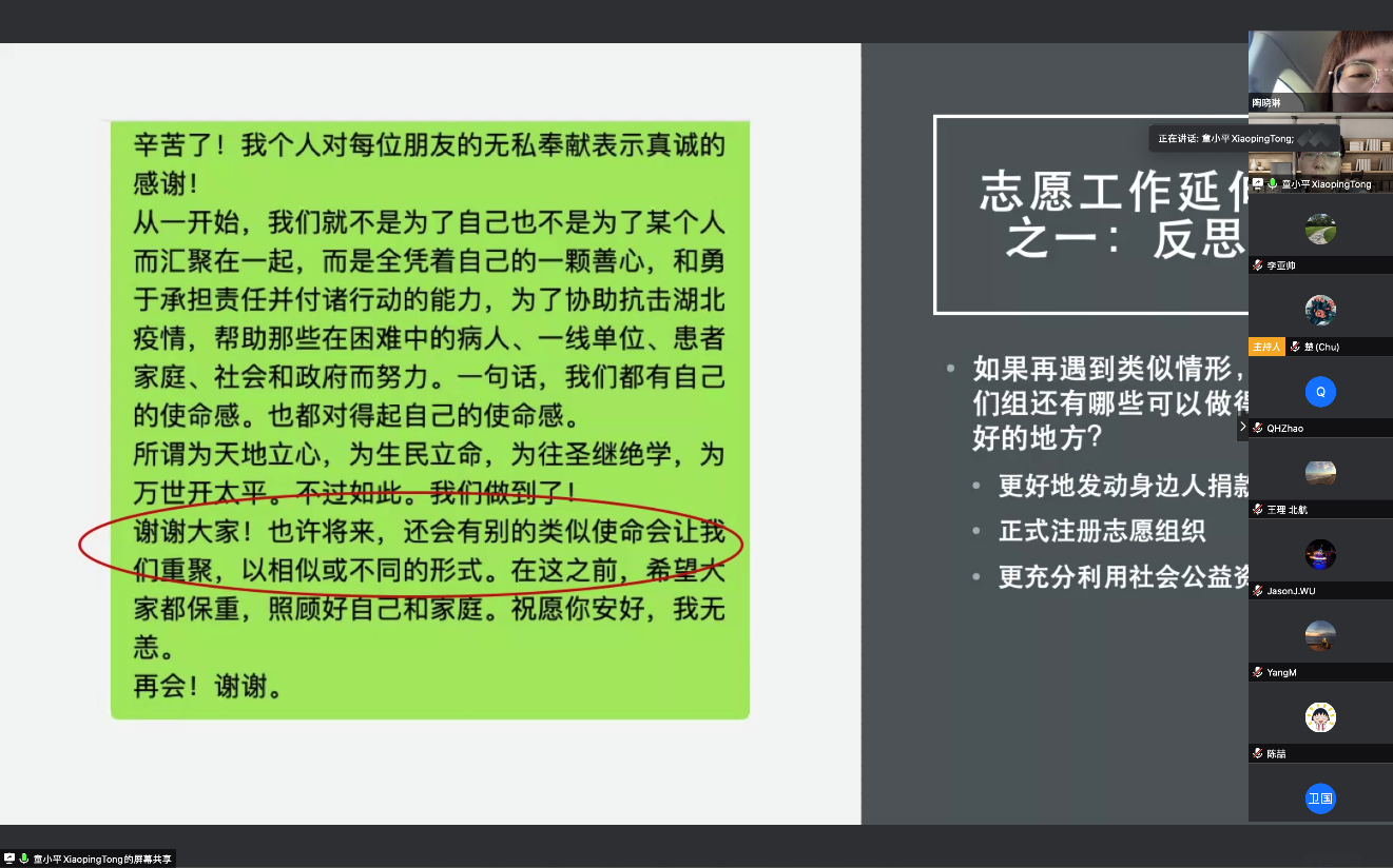会上,童小平跟大家分享了“平平归来”志愿组在抗疫物资协调过程中的五个小故事。从初次尝试,到对接海外物资、团结身边热心人士,尽管在公益中充满各种挑战,童小平和团队成员仍不忘初心,努力跟进每一项物资需求,拓展物资来源和可合作的渠道,力争为抗疫发挥更大的作用,给疫区同胞带来希望。依托“平平归来”志愿服务组的实践,童小平进一步以案例论文的形式将这次志愿活动中的优秀组织机制进行沉淀,以期为更多的公益组织提供经验与借鉴,可以在将来更充分地利用社会公益资源帮助更多人。