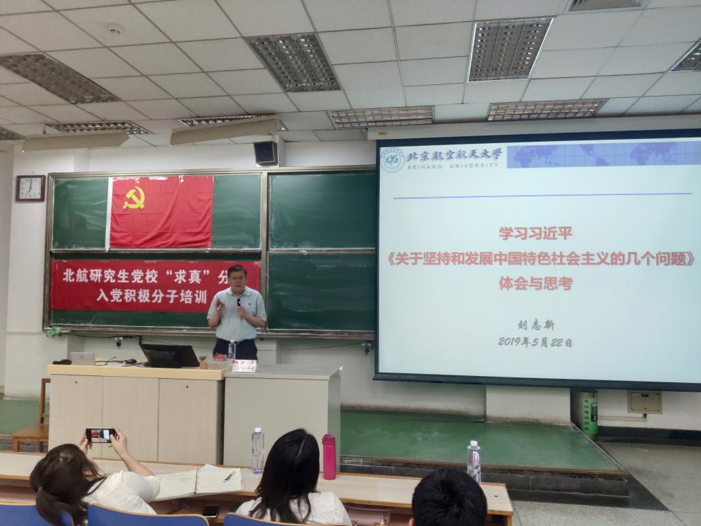5月23日晚,北航研究生党校“求真”分部第7期入党积极分子培训第二次党课在主M101教室顺利进行。来自25个不同学院的184名入党积极分子参加了本次党课的学习。本次党课的主讲嘉宾是北航经管学院党委书记刘志新教授,授课题目为“学习习近平《关于坚持和发展中国特色社会主义的几个问题》体会与思考”,党课由经管学院研究生指导主任单伟副教授主持。
