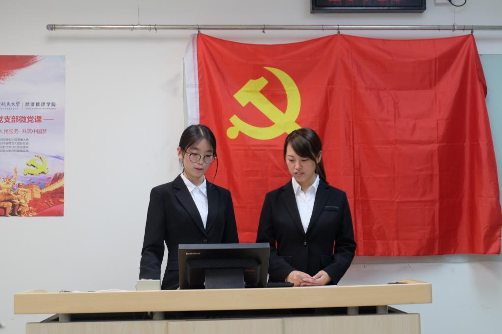 丁得彬和徐璐同志作为第一组主讲人拉开了此次党课的序幕,该学习小组的展示主题为正确认识时代责任和历史使命。丁得彬同志认为,当前中国青年的时代责任与历史使命就是把个人的追求与党和国家推进现代化建设的伟大事业结合起来。随后又从金融工作、金融市场、金融行业的独特性等角度,从所学专业出发阐述了自己眼中的使命与责任。徐璐同志通过“新时代对能源发展的要求”、“能源问题”以及“构建新时代能源体系”这三个模块,以自身为例阐述了学生党员的未来重担。在提问环节,主讲人也与观众展开了热烈的互动。最后,王晨同志总结该小组的展示,她认为上学期支部党课从宏观角度诠释了四个正确认识,该小组从专业背景、客观现实出发,在上学期的基础上深入研究并思考,为其他同志树立了很好的榜样。此外,青年学生们将是两个一百年奋斗目标完成的见证者,王晨同志鼓励大家要结合现实深入思考,不断反省自身,早日成为国家的栋梁之材。