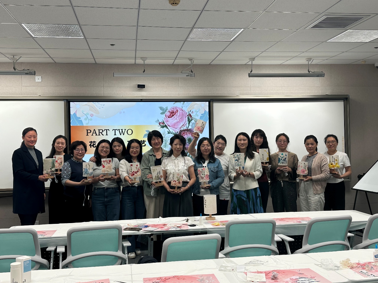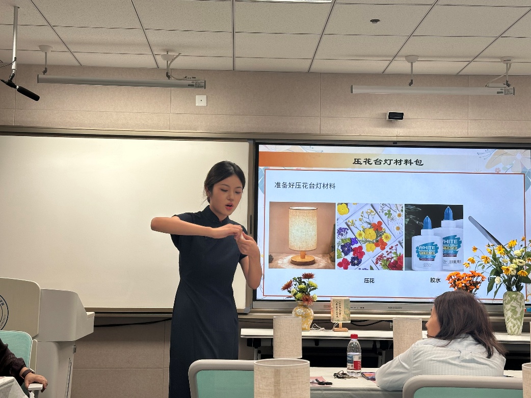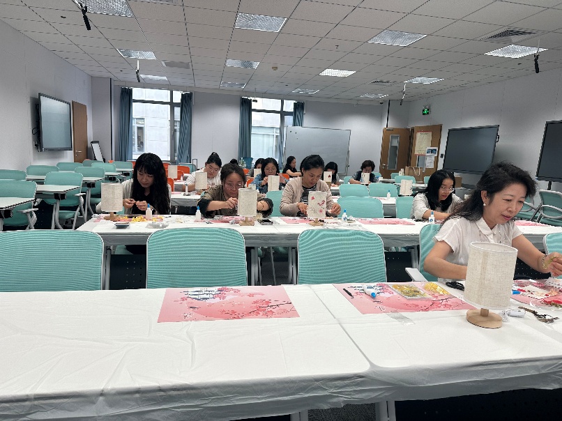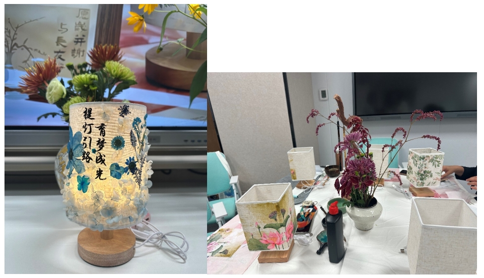 活动伊始,指导老师向大家介绍了手工灯的文化寓意与制作方法,并进行了现场演示。随后,教师们在轻松的氛围中展开创作。本次活动准备了两种灯具样式:一是圆柱形灯,参与者们用白乳胶将花朵细致粘贴在灯罩上,营造出温馨雅致的画面;二是长方体灯,老师们在灯面挥毫泼墨,写下节日寄语,再点缀真花,形成独具韵味的作品。