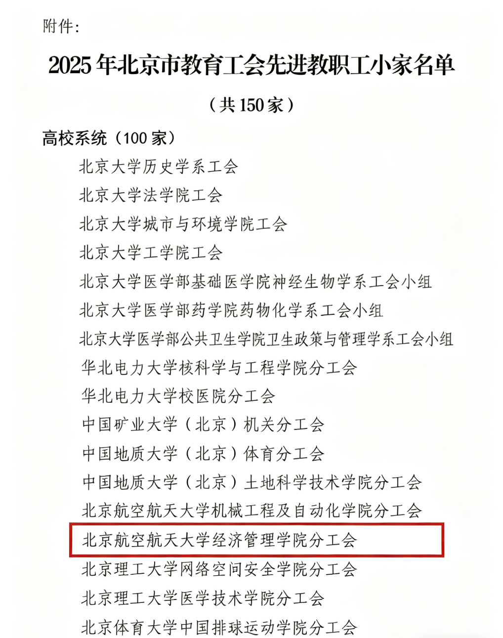 从初建到成熟,从服务到引领,北航经管学院工会小家始终是教职工的心灵驿站与成长的平台:这里有学术交流的思想碰撞,有困难帮扶的温情暖意,更有集体活动的欢声笑语。此次获评北京市先进教职工小家,既是荣誉更是动力。聚力创新筑小家,温情服务为大家。学院工会将继续秉承“温情服务、共建共享”的核心理念,以更高标准、更实举措深化“小家”建设,为教职工办实事、解难题,持续凝聚起建设世界一流经管学院的智慧与力量。