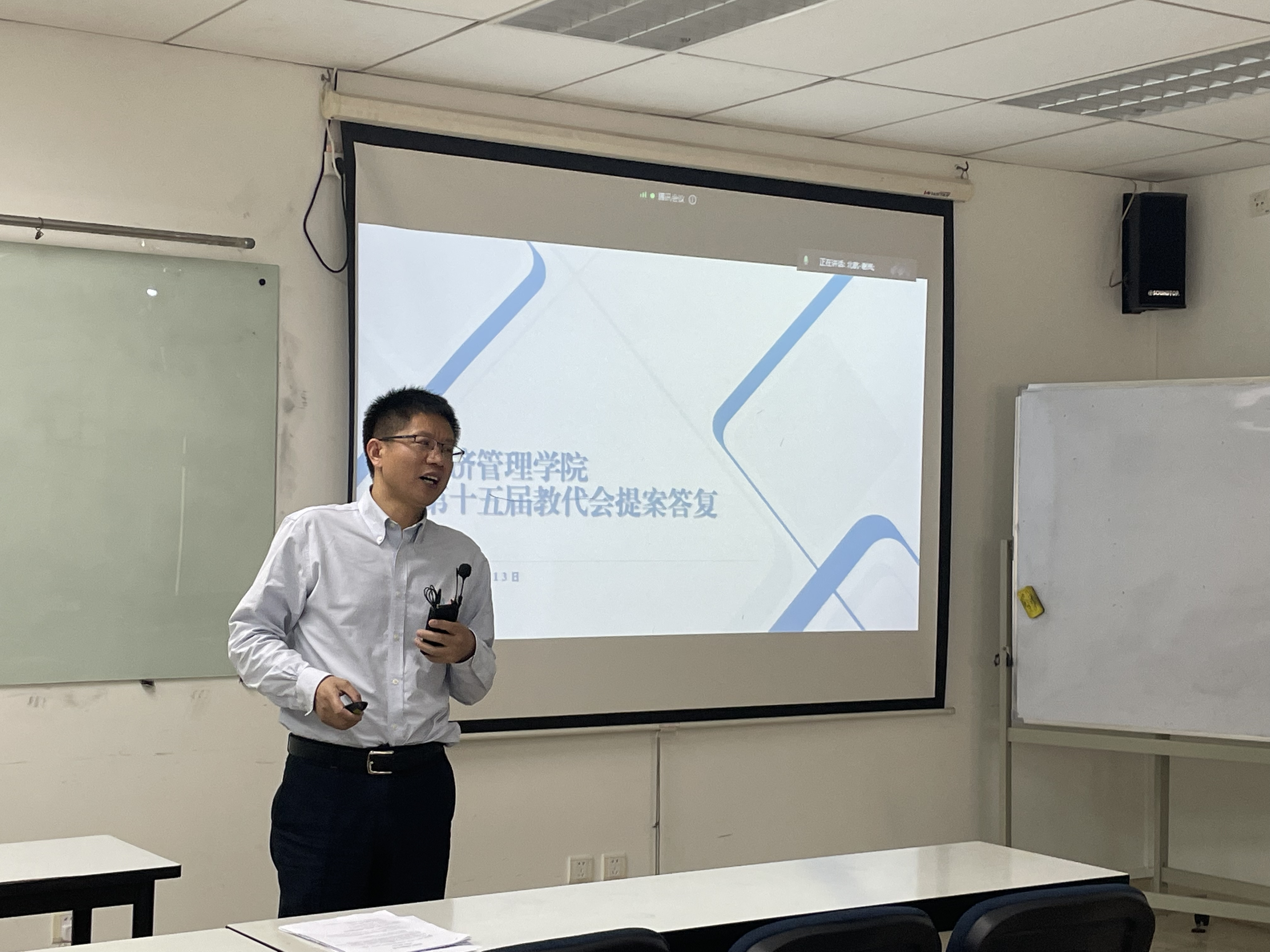 在会上,党委书记郑海涛代表党政联席会对提案进行了逐一答复。针对学生培养工作的费用标准认定问题,学院对课时费标准进行测算和修订,于2023年1月5日提交党政联席会审议,审议通过了研究生论文相关工作量标准。针对退休教师相关管理制度问题,学院委派工会开展调研,结合调研结果,学院将进一步加强活动策划,为当年退休教师制作个性化纪念品,并在每年教师节前夕举办荣休欢送活动,强化学院文化传承,营造温馨氛围,逐步完善荣休欢送制度;同时,学院也明确了针对退休教师的科研教学贡献认定及奖励政策,并计划结合学校相关规定和学院实际情况制定退休教工返聘制度。针对师生双选机制问题,学院将提前开放导师双选系统,促进师生双向充分沟通。针对新主楼物业管理方面的问题,已向物业反映帮助解决,同时也将向学校有关部门进行反映。