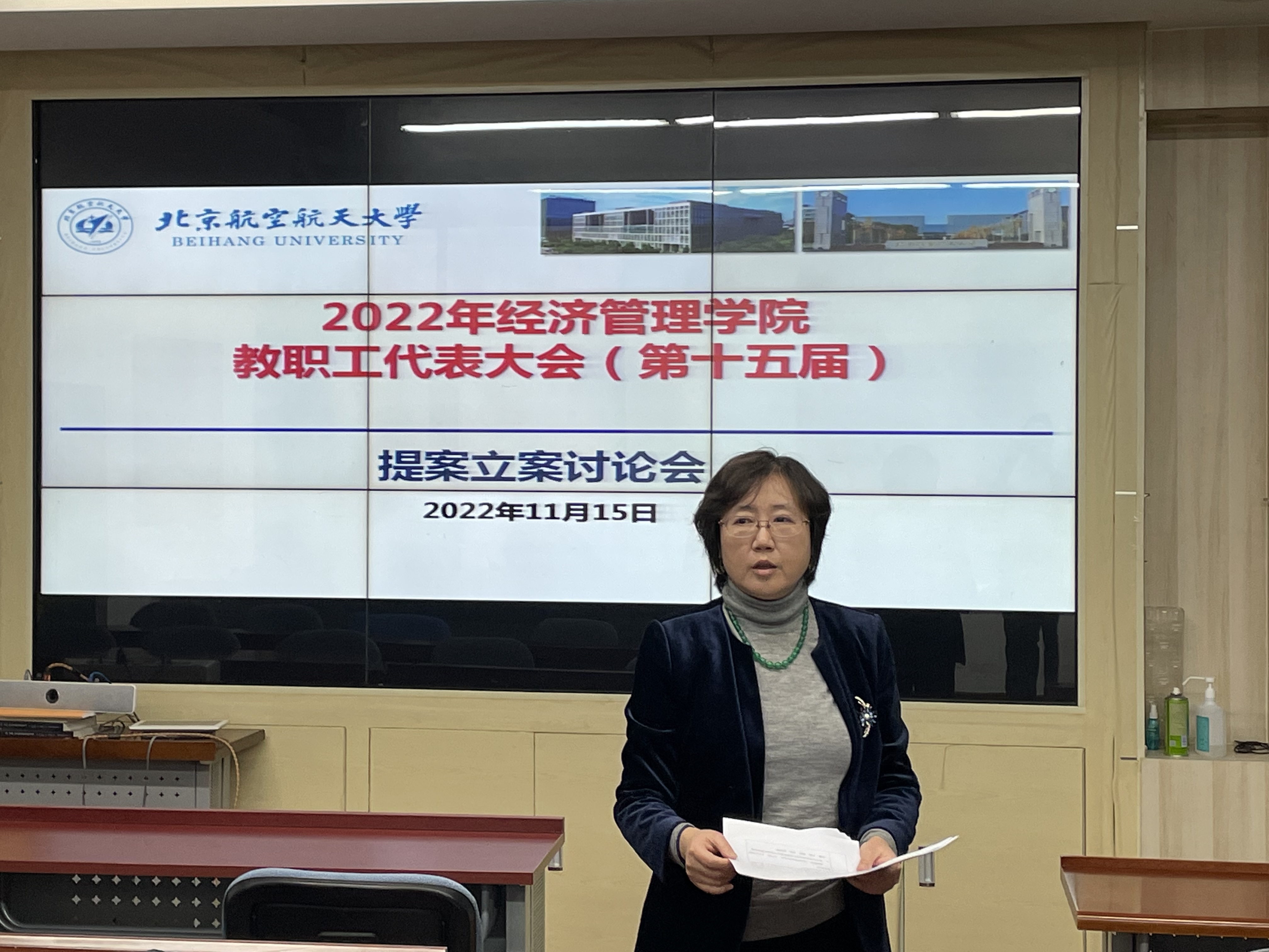 2022年11月15日中午,经管学院在新主楼A618召开了第十五届教职工代表大会提案立案讨论会。学院工会主席谢岚主持了此次会议,共有近二十名教代会代表参加了此次会议。