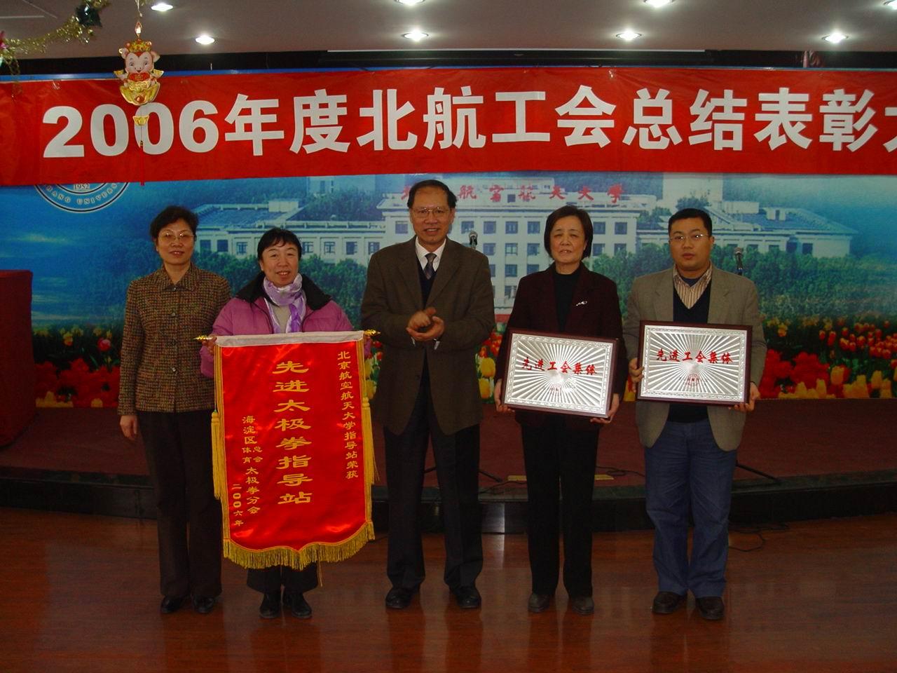 2007年1月23日,经管学院工会双喜临门:在思源楼召开的2006年度北航工会总结表彰大会上,bat365官网工会作为北航推选出的唯一基层工会代表,获得了北京市教育工会颁布的“先进工会集体”荣誉;同时,bat365官网工会还正式通过了学校评审、获得北航“模范教职工之家”荣誉称号。在这次评审会上,经管学院工会同时还获得了“2006年度工会活动组织一等奖”和“2006年度工会各项竞赛活动第八名”两个奖牌以及“2006年度工会工作创新奖”和“2006年度工会宣传工作先进单位”两张奖状;短短两个小时的表彰会上,七次派代表上台领奖,取得了多年来最丰硕的成果。北航校长李未和北航工会主席纪素菊为获奖单位颁奖;经管学院党总支李清书记、工会主席高志红老师及院工会全体委员参加了表彰大会。
