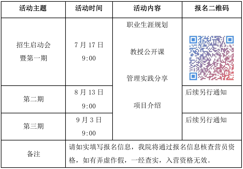 招生宣传活动内容包括开营仪式、职业生涯规划讲座、教授公开课、管理实践分享、项目介绍。招生宣传活动共分三期,可任选一期参加。