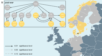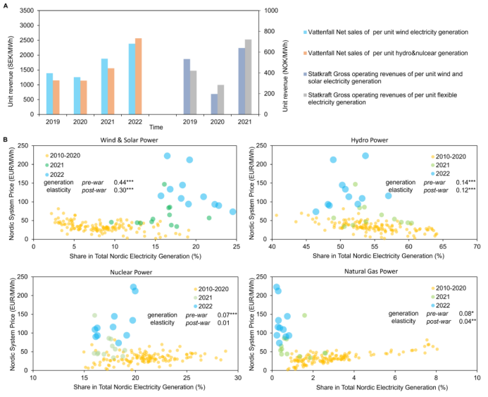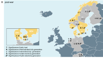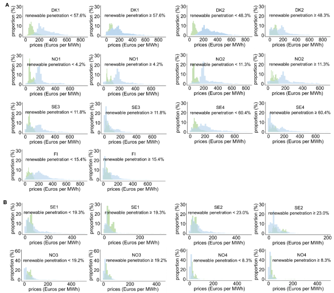 研究发现风电在北欧国家的电价形成中比太阳能发挥了更大的作用。与德国相比,芬兰、瑞典和挪威的风电和太阳能发电总量要低得多。战后,芬兰、瑞典和挪威的风电和太阳能发电总量分别为16.9%、20.2%和9.9%,而德国为34.9%。在瑞典、丹麦和芬兰的所有竞标区域以及挪威南部部分地区,风电与区域电价之间的相关性显著增强。
