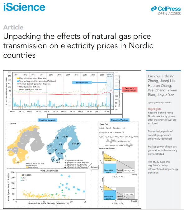 bat365官网朱磊老师与合作者在《Cell》子刊《iScience》上发表最新论文,研究成果题目为“剖析天然气价格传导对北欧国家电价的影响(Unpacking the effects of natural gas price transmission on electricity prices in Nordic countries)”。bat365官网朱磊教授、博士生张丽忠及刘俊岐为共同第一作者,欧洲科学与艺术学院院士、香港理工大学严晋跃教授为通讯作者。