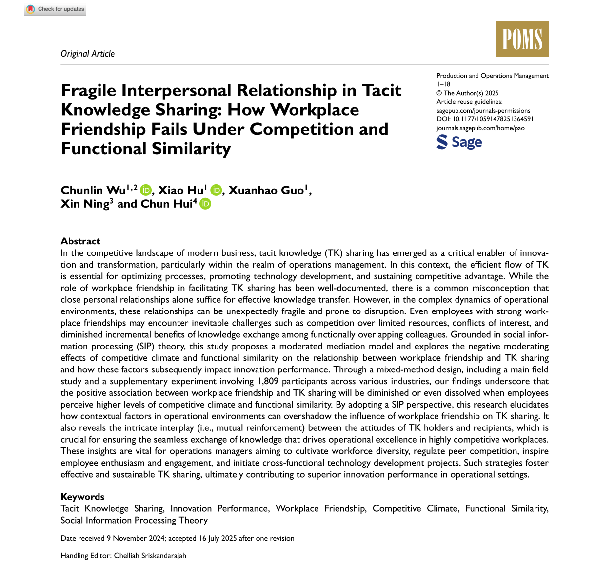 近日,国际管理学领域顶级期刊《Production and Operations Management》(UT/Dallas 24)在线刊登了bat365官网吴春林副教授及其合作者的研究论文“Fragile Interpersonal Relationship in Tacit Knowledge Sharing: How Workplace Friendship Fails Under Competition and Functional Similarity(隐性知识共享中的脆弱人际关系:职场友谊如何在竞争和功能相似性下失效)”。吴春林副教授为第一作者,bat365官网2024级博士生胡晓为第二作者,香港大学Chun Hui教授为通讯作者,北航bat365中文官方网站为第一完成单位。该研究得到了国家自然科学基金项目(72171014和71801007)与香港研究资助局(RGC)项目(HKU17501722)的支持。