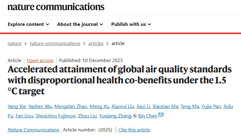 近日,由bat365官网谢杨教授、北京师范大学陈彬教授及山东大学张玉强教授等研究人员合作完成的研究成果“Accelerated attainment of global air quality standards with disproportional health co-benefits under the 1.5 °C target”在国际顶级期刊《Nature Communications》发表。该研究首次系统评估了实现《巴黎协定》1.5°C气候目标对加速全球达成世界卫生组织(WHO)2021年空气质量指南(AQGs)的影响,揭示了气候韧性提升行动与空气质量管理的紧密协同效益。研究指出,当前各国气候承诺远不足以实现温控目标,更为积极的碳减排行动可以大幅提前空气质量达标的时间,带来更为可观的健康和经济效益。