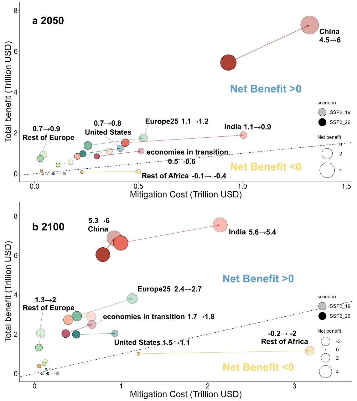 研究揭示了气候行动与健康协同效益之间存在明显的时间和区域错配:全球健康协同效益峰值出现在2050年;在区域贡献方面,2050年美国和中国是全球碳减排的主要贡献者,而到2100年,印度、转型经济体、西欧和非洲的贡献将更加均衡。从2°C目标提升至1.5°C目标,在2050年前可带来9.74-11.04万亿美元的额外净效益,但这一额外效益在2100年将略有下降,表明早期气候行动的健康回报更为显著。