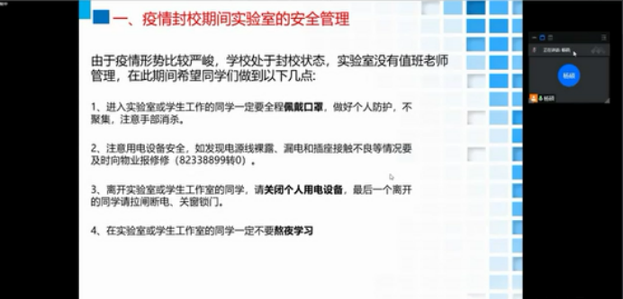 bat365中文官方网站实验中心于2022年6月2日上午组织实验中心有注册机位的同学参加线上消防安全培训(1学时课程),本次培训课由杨硕老师主讲。主要培训内容为实验室火灾案例分析、疫情封校期间实验室安全管理注意事项、危险源的辨识方法、相关消防设施介绍、灭火器使用方法、如何正确拨打电话报告火警、实验室安全准入管理要求等。讲解中,杨硕老师特别强调了封校期间实验室的安全管理、灭火器的使用方法和实验室安全准入管理等重点事项。