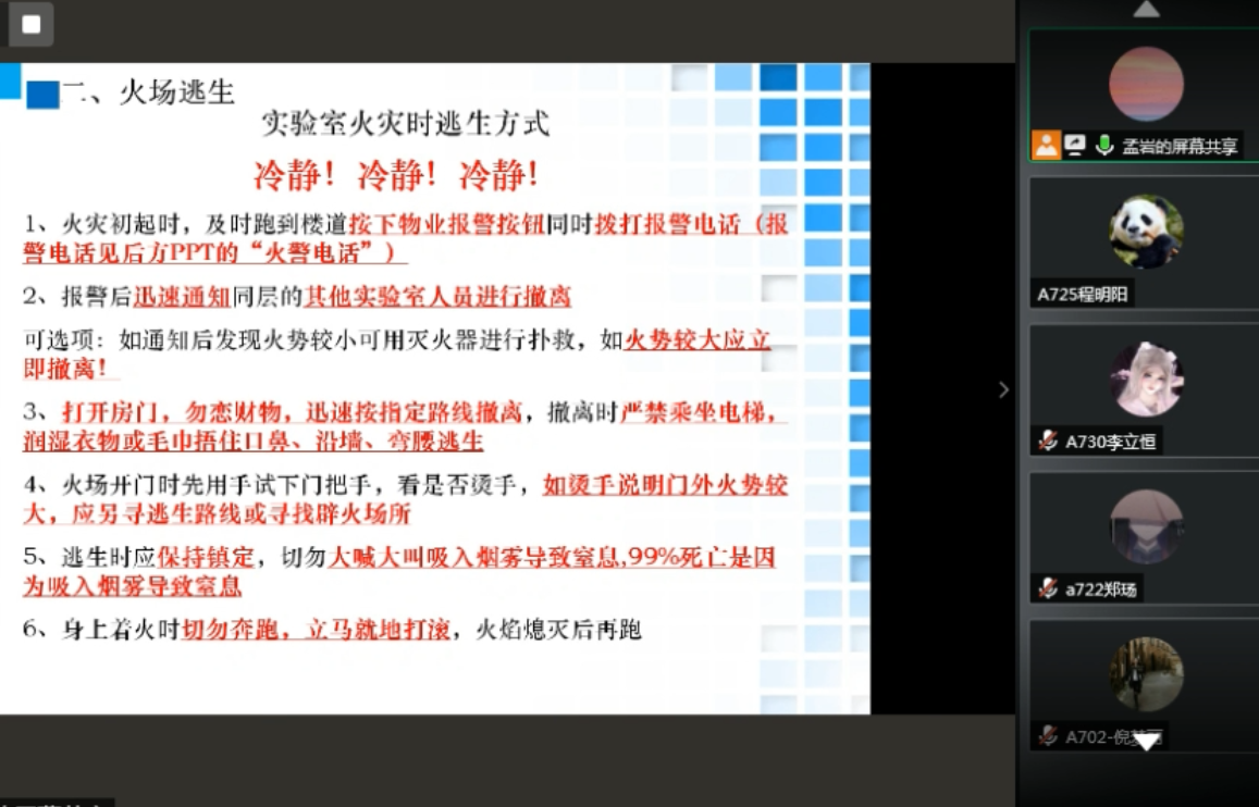 本次培训是实验中心上半年第二次消防安全培训(由于疫情原因于9月采取线上培训方式),培训目的是提高学生的消防安全意识,让大家熟悉并严格遵守实验室相关管理制度,通过案例讲解和视频演示让大家熟知消防安全各项技能,如何报火警及快速逃生技巧等内容。