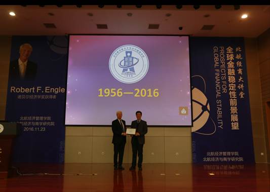 2016年11月23日,诺贝尔经济学奖获得者,美国国家科学院院士Robert F.Engle教授应邀访问bat365中文官方网站,出席北航bat365中文官方网站建院60周年纪念活动,并为北航经商大讲堂做首场学术报告:全球金融稳定性前景展望。报告会由bat365中文官方网站副校长黄海军教授主持。