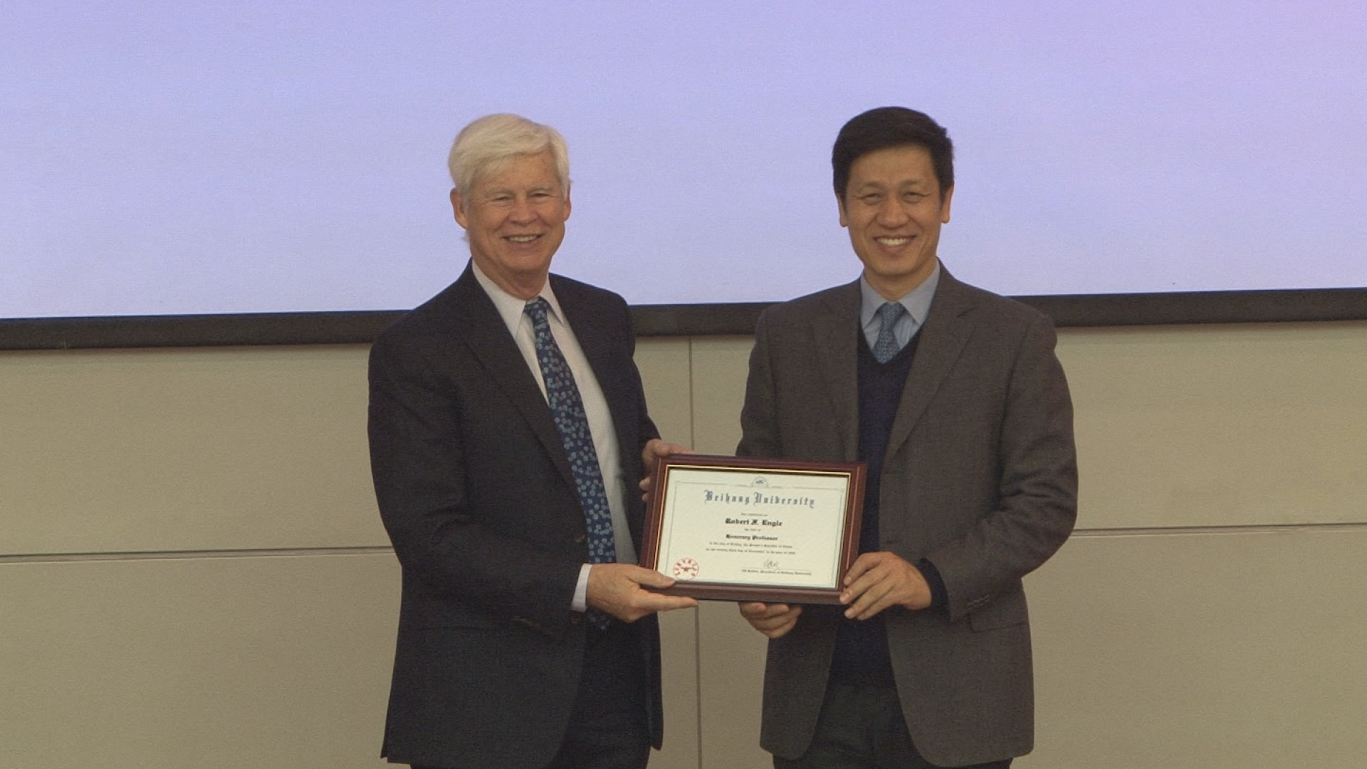 徐惠彬校长在致辞中谈及,北航作为全国知名的高水平大学,经过六十多年的发展,在科技创新方面走在全国高校前列,形成科技创新的北航模式。大学承担探索未来知识的使命和责任,经济学与商学是人类社会共同关注的热点方向之一,也是当前国家重点关注的研究方向。大力发展经济学与商学是北航建设国际一流大学的重要支撑之一,希望经济与商学研究院作为学科发展的重要平台,将该学科打造成建设国际一流的学科增长点。这里很荣幸可以邀请到诺贝尔经济学奖获得者Robert F. Engle教授访问北航并受聘我校荣誉教授,Robert F. Engle教授的加盟将助力于我校经济学与商学研究院建设,促进国际合作,推进北航经济学与商学的学科发展。