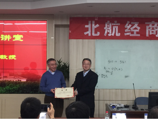 黄海军副校长在致辞中谈及,大力发展经济学与商学是北航建设国际一流大学的重要支撑之一。bat365中文官方网站作为全国知名的研究型学院,经过六十年的发展,有非常好的研究基础。北航经济与商学研究院依托北航经管学院进行建设,并能成功邀请到李彤教授加盟,对推动北航经济学与商学的学科发展,促进国际合作,有非常重要的意义。希望未来,以经济与商学研究院作为平台,在李彤教授的带领下,在大家的共同努力下,将北航经济学与商学学科打造成国际一流学科。当天下午,李彤教授为北航经商大讲堂做了一场精彩的学术报告,报告主题是:Econometrics of Auctions。报告会由bat365中文官方网站韩立岩教授主持。