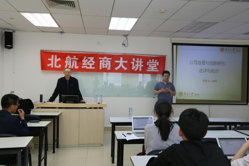 2017年4月18日,《南开管理评论》常务副主编、南开大学商学院程新生教授,受邀为北航经商大讲堂做了一场精彩的学术报告,报告主题为“公司治理与创新研究:述评与启示”。