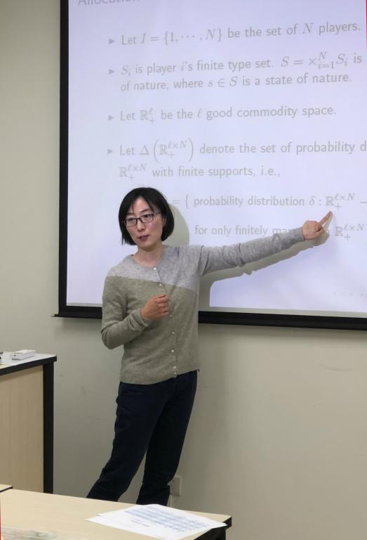 2018年5月11日,北航经商院•经济学双周论坛迎来了2018年春季的第五期讲座。此次主讲特别邀请到了首都经济贸易大学国际经济管理学校刘知微副教授,其于2014年在伊利诺大学香槟分校取得经济学博士学位,研究专注于实施理论、博弈论、一般均衡理论。此次报告题目是“不确定性条件下混合策略的执行”,证明了Prescott和Townsend (1984)的竞争均衡分配,maxmin的核分配,maxmin的值分配,以及不公开的maxmin 理性预期均衡分配,都是混合策略激励兼容的,都可以在混合策略的maxmin均衡中完全地执行,而这些结果在贝叶斯偏好下不成立。