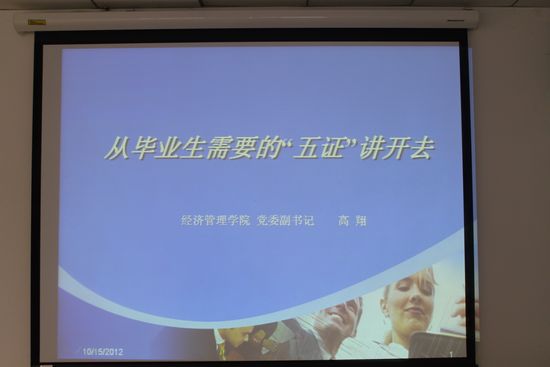 10月12日(周五)晚6:30,经管学院2009级全体学生在主南201组织进行了就业主题班会,会议由辅导员姜姗、邱冲主持,邀请经管学院党委副书记高翔老师为学生们详细讲解有关大四毕业相关档案文件的处理流程和注意事项等...