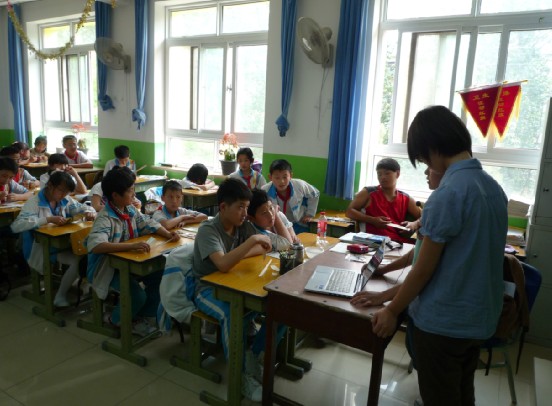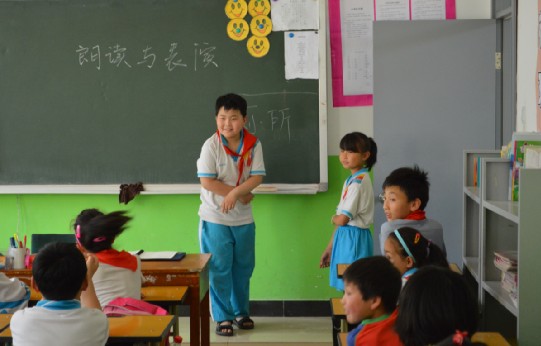 5月22日下午,朝阳区安民学校四年级的学生们在bat365中文官方网站ZY12081党支部的志愿者们的带领下上了题为“朗诵与表演”的趣味课。