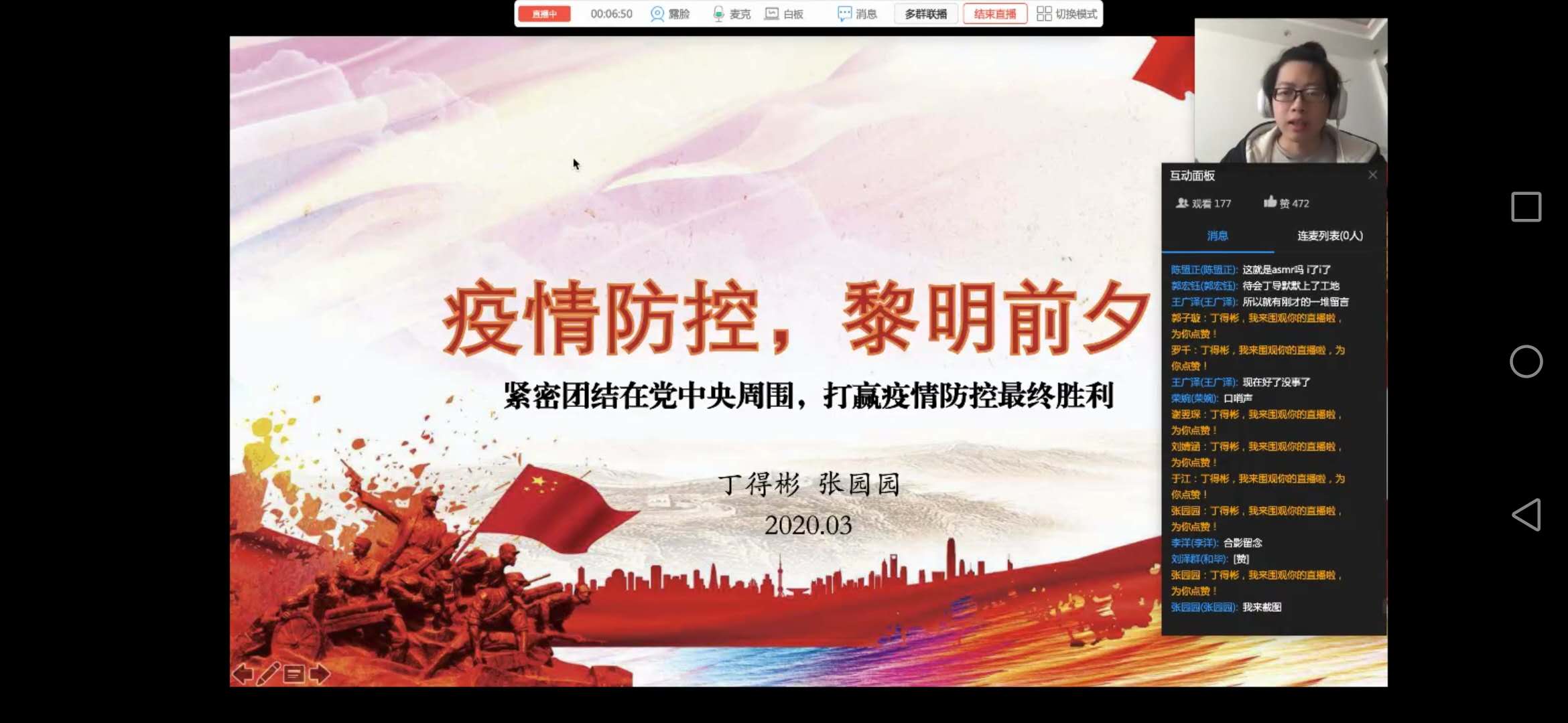 2020年4月15日15:00,《疫情初期国外媒体报道中国抗疫的三种面孔》主题党课顺利举办,本次课程面向经管学院所有年级开放,以腾讯课堂线上直播形式开展。本次党课由辅导员白雪主持,各年级辅导员、学生党员、学生干部以及学生代表等370余名学生参加。本次党课的主讲人为马克思主义学院刘娜娜副教授,刘娜娜老师于2019年获首届全国高校马克思主义理论学科优秀博士学位论文奖(全国仅三人),曾两次荣获北航“我爱我师”十佳优秀青...