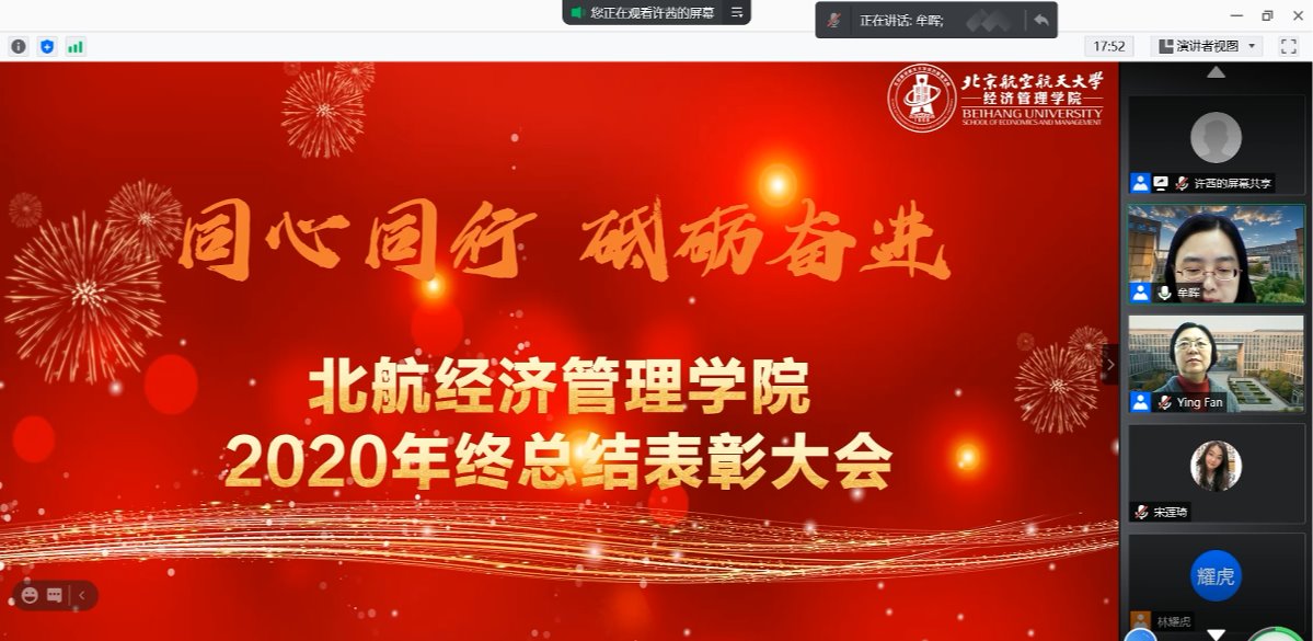 2021年1月14日,bat365中文官方网站举办“同心同行,砥砺奋进”——bat365中文官方网站2020年度总结表彰大会。为贯彻落实学校疫情防控工作有关要求,今年以视频会议的形式举办。学院全体教职工、退休教师代表、学生辅导员等200余人参加了会议。大会由牟晖副院长主持。范英院长首先代表学院做2020年度经管学院工作报告。范院长指出,2020年是全面建成小康社会和“十三五”规划收官之年,也是谋划“十四五”规划的关键之年,经管学院全面深入推...