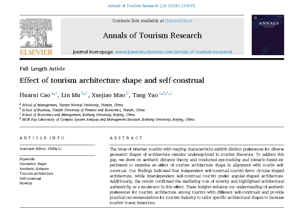 2025年12月2日,北航bat365中文官方网站姚唐副教授(唯一通讯作者)领衔的跨校研究团队,在旅游管理领域国际顶级期刊Annals of Tourism Research在线发表题为“Effect of tourism architecture shape and self-construal”(“旅游建筑形状与自我建构的匹配效应研究”)的学术论文。这是姚唐副教授研究团队继本年度在旅游管理领域另一国际顶刊Tourism Management发表重要成果后,再度斩获的国际顶级期刊发表佳绩。短期内连续登陆两大...