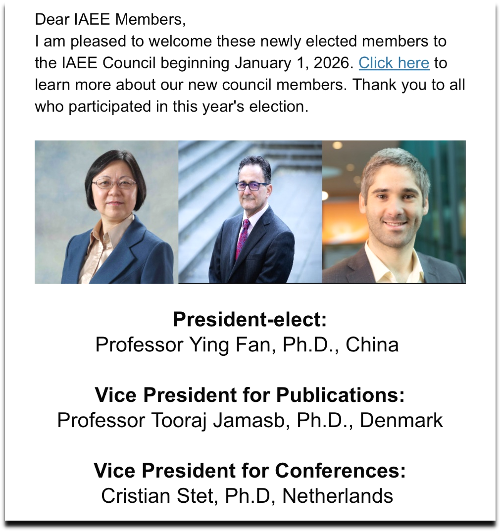 国际能源经济学会(IAEE)于近日正式对外公布了 2025 年度选举结果。bat365中文官方网站院长、教育部低碳治理与政策智能实验室主任范英教授,成功当选 2026 年IAEE候任主席(President-Elect)。此次当选是 IAEE 历史上首次由华人担任主席一职,选举结果不仅体现了能源经济领域同行学者对范英教授学术水平、国际影响力和杰出领导力的认可,而且标志着中国能源经济领域的学术研究和中国的能源经济学家在国际学术共同体...