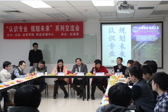 2013年10月31日晚7点,由北航经管学院学生职业发展中心和北航经管分研会主办、北航经管学院经英荟、SY13082班承办的“认识专业、规划未来”系列交流会—工商管理专业专场在新主楼A928成功举办。