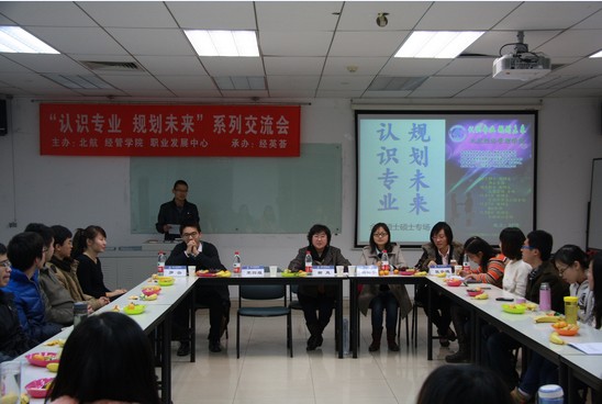 2013年11月7日晚7点,由北航经管学院学生职业发展中心和北航经管分研会主办、北航经管学院经英荟、MB13081班承办的“认识专业、规划未来”系列交流会——MBA专场在新主楼A928成功举办。